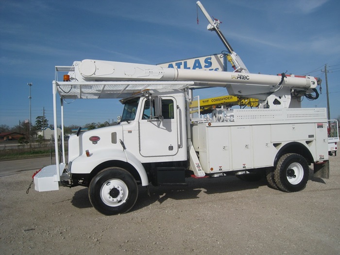 MOUNTED ON: 2004 Peterbilt 330, 126,500 Miles, CAT, 6 Speed, Curb Side Access, 4 Outriggers, Material Handler, Front Winch, Rear Winch. BUCKET: Altec AM650, 55 Foot Working Height.